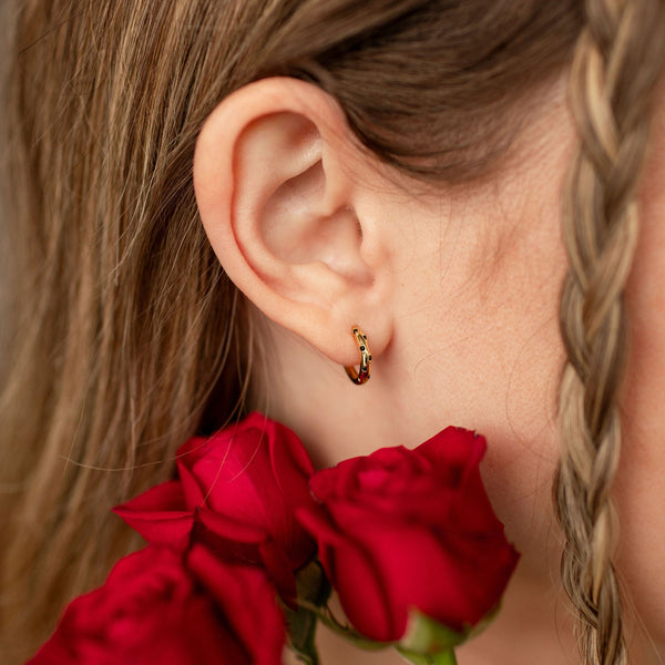 Featuring a huggie closure style and made from from high quality gold vermeil (thick layer of gold over a sterling silver base). Perfect on their own or in an earring stack! Hypoallergenic and safe for sensitive skin! Stones made with high quality imitation black onyx.