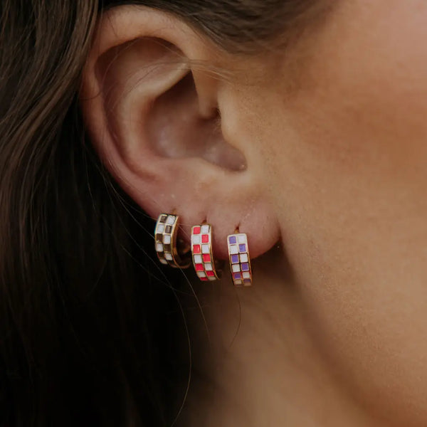 The Purple & White Checkered Hoops are made of high quality gold fill and are hypoallergenic and good for sensitive ears. They have a huggie closure style and are the cutest new jewelry trend! Outer diameter is 10mm.